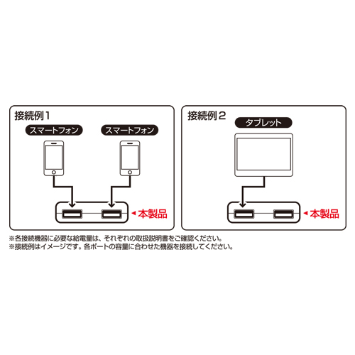 ●※2 iPadなどのタブレット端末にはおおよそ2.4A、iPhoneや各社のスマートフォン端末にはおおよそ1.0A-1.3Aの給電が必要となります。