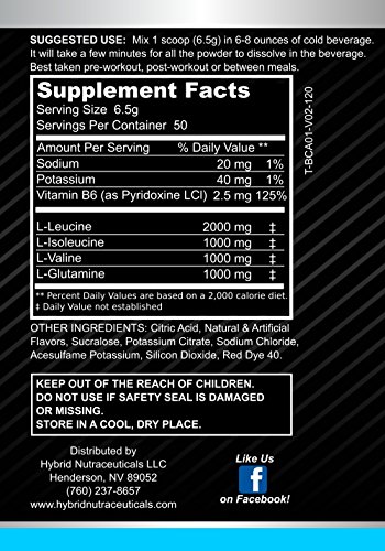 Ingredients! BCAA - Branched Chain Amino Acids (L-Leucine, L-Isoleuchine, L-Valine),L- Glutamine, Sodium, Potassium, Vitamin B6 (as Pyridoxine HCl)
