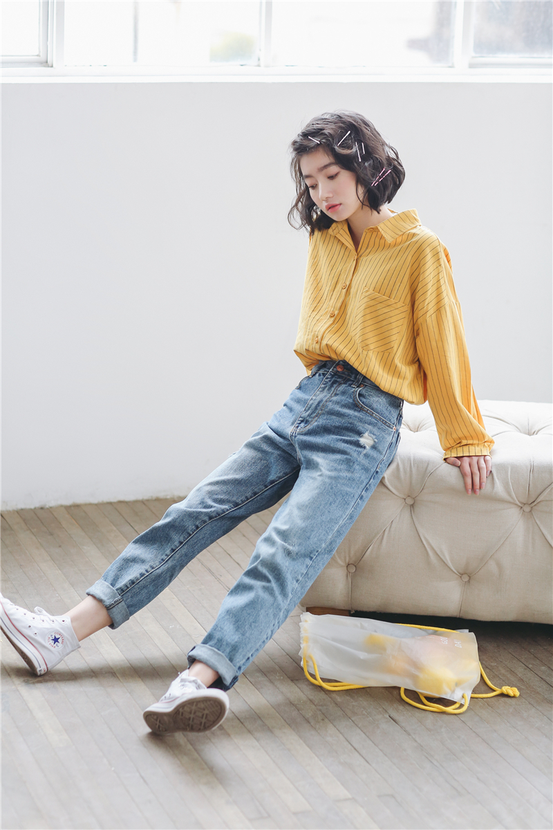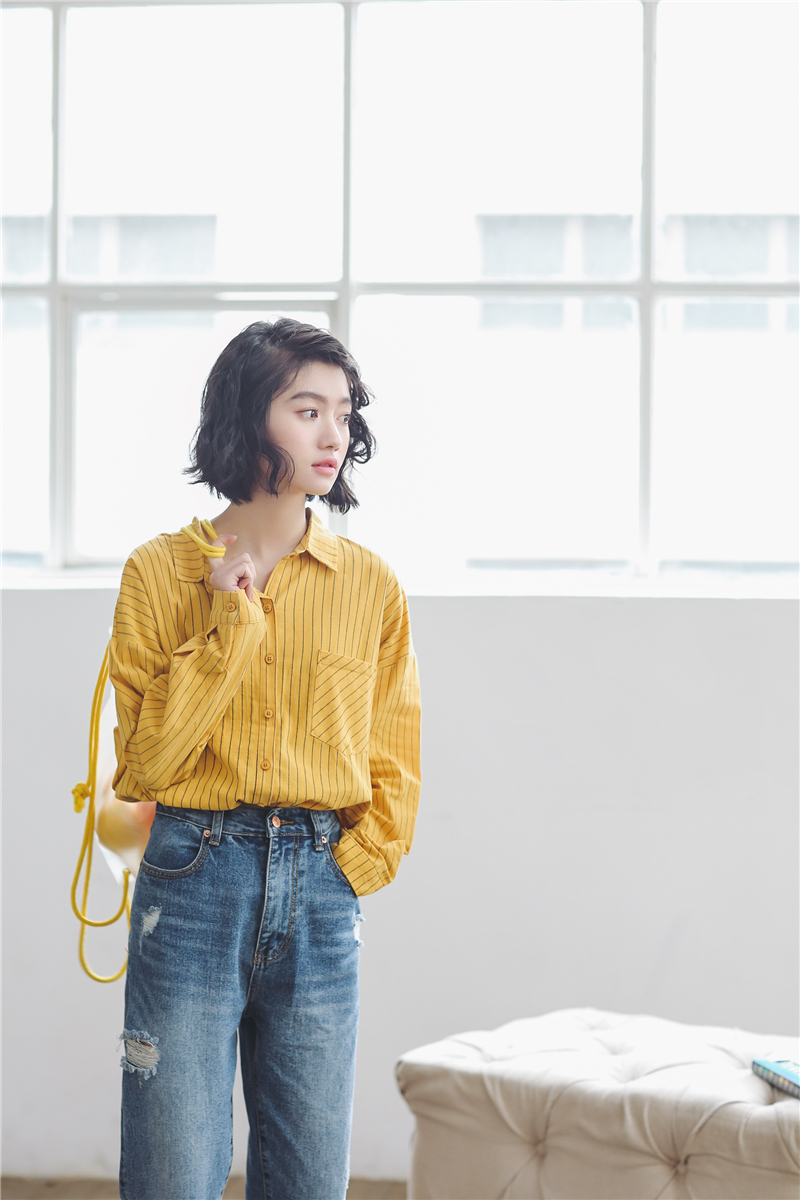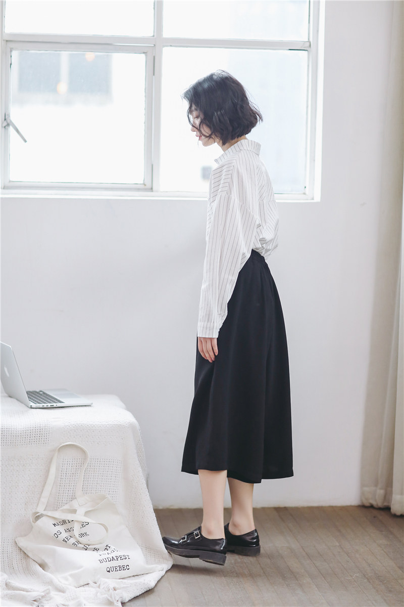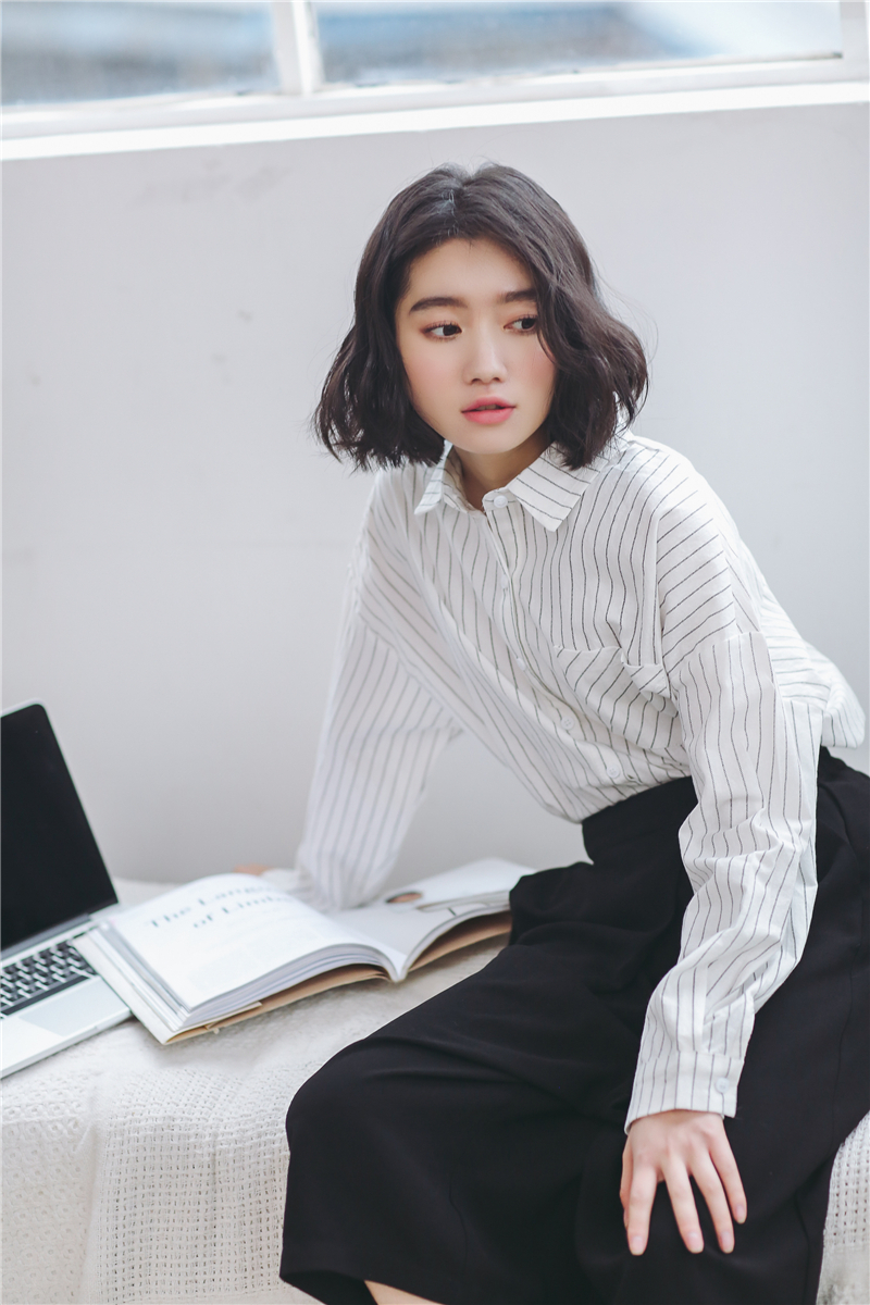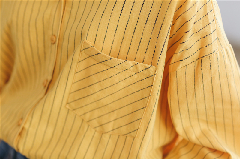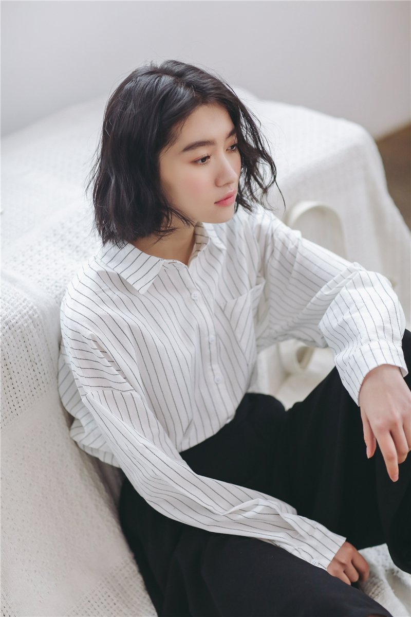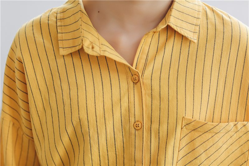 柔らかな素材が女性らしく、シンプルなデザインが大人っぽい雰囲気の長袖ストライプ柄シャツです。