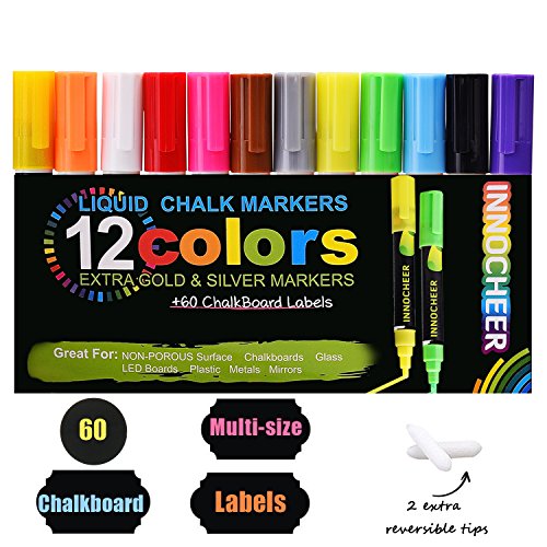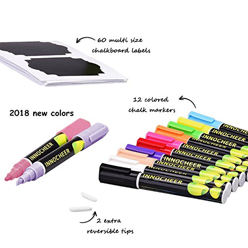 Chalk Markers 12 Pack with 60 Pcs of Multi-Size Chalkboard Labels, Reversible Tips - Non-Toxic, Odorless, Erasable by INNOCHEER