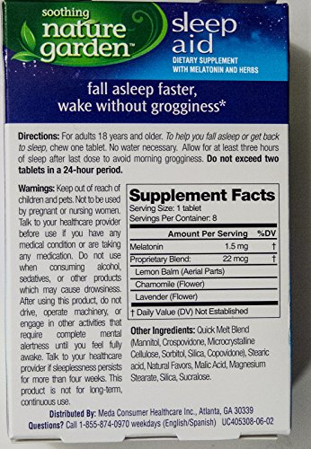 -. Binding : Health and Beauty -. Brand : Nature Garden -. EAN : 0346017053081 -. Feature : 4 Boxes of Cherry-Flavored Chewable Tablets - 8 ct per box (32 tablets total) / Nutritional supplement with melatonin and herbs / Natural sleep aid - Fall into a natural sleep fast / Wake without grogginess / Natural Sleep Ingredients Not Habit Forming/Drug Free -. IsAdultProduct : 0 -. Label : Concepts in Health, Inc. -. Manufacturer : Concepts in Health, Inc. -. PackageQuantity : 4 -. ProductGroup : Health and Beauty -. ProductTypeName : HEALTH_PERSONAL_CARE -. Publisher : Concepts in Health, Inc. -. Studio : Concepts in Health, Inc. -. Title : Soothing Nature Garden Sleep Aid Remedy (4 Boxes - Total 32 Cherry tablets) -. UPC : 346017053081