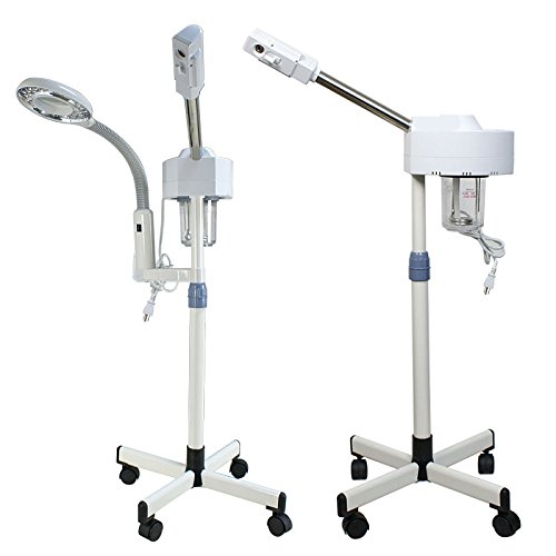 -. Feature : Professional 'Facial Steamer' + Magnifier Lamp / Professional 2-in-1 Facial Steamer:Stainless steel heating pipe,Rotation of hot spray pipe,Height adjustable,4-leg wheeled stable stand base.Easy to move around in the salon. / Magnifier Lamp:Super Clear Magnifier With Table Fixing Clamp,Flexible Arm to Reach to any Direction you wish,LED Light Bulbs, Bright and Save Electricity. / Protective Lens COVER,5 Times Magnification,simple control. / Warm Note:Not recommend use distilled water the first use,use purified water or tap water.The sensor may not feel the PH value of the distilled water,it will beep to alert.You can add a little salt or vinegar to the water.Please pay attention to the size,if you think it is small,please do not order.