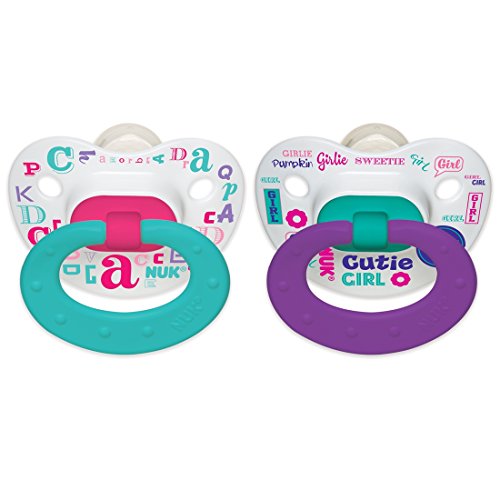 -. Binding : Baby Product -. Brand : NUK -. Feature : Juicy Pacifiers with classic puller and bright pastel colors with no design / Features our improved nipple that soothes and calms baby better than our original nipple and an asymmetrical shape that helps promote healthy oral development by naturally fitting into your baby's palate / Scoop nipple cavity allows maximum tongue movement, which gently exercises your baby's tongue, palate and jaw and promotes proper teeth alignment by helping your baby avoid thumb-sucking / Heart shaped shield fits perfectly under baby's nose for easy breathing and less irritation / BPA free with silicone orthodontic nipple -. Label : NUK -. Manufacturer : NUK -. PackageQuantity : 1 -. ProductGroup : Baby Product -. ProductTypeName : BABY_PRODUCT -. Publisher : NUK -. Studio : NUK -. Title : NUK Baby Talk Puller Pacifier in Assorted Colors and Styles, 0-6 Months