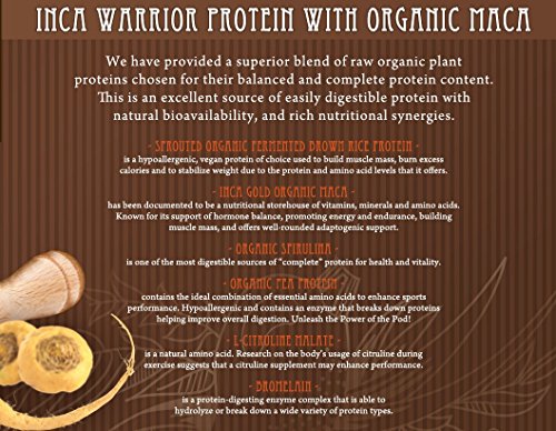 Organic Cacao (Theobroma Cacao) is the purest form of chocolate you can consume, which means it is raw and much less processed than cocoa powder or chocolate bars. Cacao is thought to be the highest source of antioxidants of all foods and the highest source of magnesium of all foods. We have provided a superior blend of raw organic plant proteins chosen for their balanced and complete protein content. This is an excellent source of easily digestible protein with natural bioavailability, and rich nutritional synergies. The key ingredients in the protein powder are Certified Organic. We use Organic Ingredients (Certified Organic). This is a clean and pure powder (no chemicals or hidden ingredients). There are no fillers or preservatives in our protein powder. We are lab tested for verification and purity. We "use Raw Inca Gold organic Maca, harvested by hand, aged and sun dried to perfection, to support energy production as well as healthy, balanced hormones". AND all these apply: Vegan, Certified Organic, Dairy Free, Soy Free, Live Enzymes, No Whole Grass Fillers, No Added Sugars, No Artificial Flavors or Sweeteners, No Preservatives.Feature