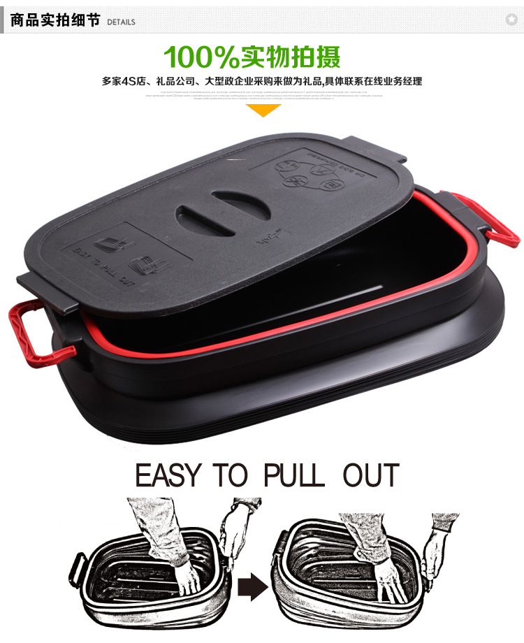 3、特征二:解决了车后备箱内不易放置带有液体类物品的难题。如意桶四周密封,不漏水。可以放置带有碱、酸、盐、油性液体类物品,如海鲜、冰块,蔬菜、油品等。使用后容易清理清洗。