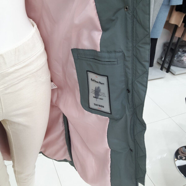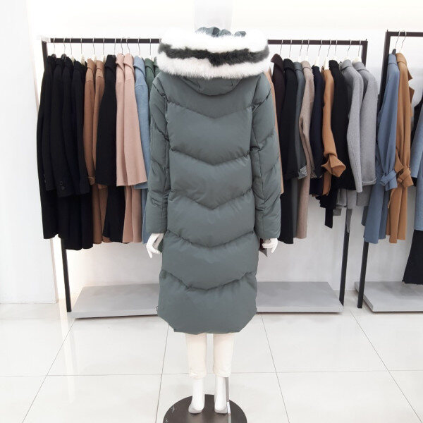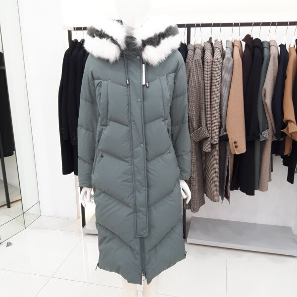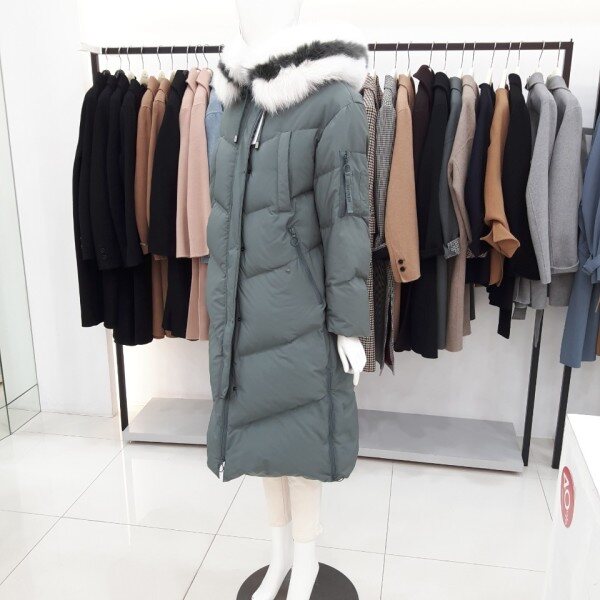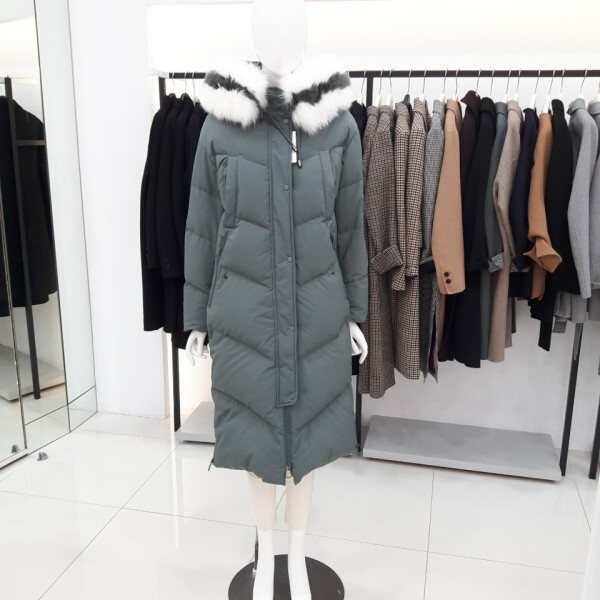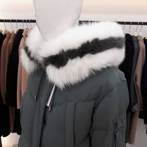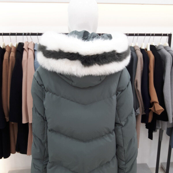 티렌 투톤 형식의 여우털100%퍼와 가벼운구스다운의 롱 패딩입니다 밝은카키느낌의 안감도 핑크로 산뜻한 롱패딩 입니다