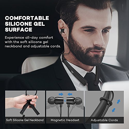 Comfortable silicone gel surface: Via TaoTronics neckband Bluetooth headphone, you can enjoy cozy & secure for all day wear with soft silicone gel surface, magnetic headset and adjustable cords