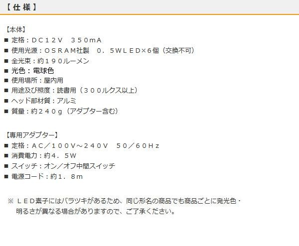| アルミボディ&コンパクトサイズのクリップライトです。ヘッド部は約350度の角度調節が可能ですので、光の向きを自由に変えられます。中間スイッチ付きなので、オン/オフが簡単にできます。 |