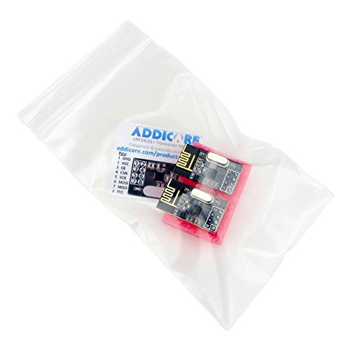 Pins are protected in anti-static foam and modules are in resealable packaging with Addicore nRF24L01+ product information card