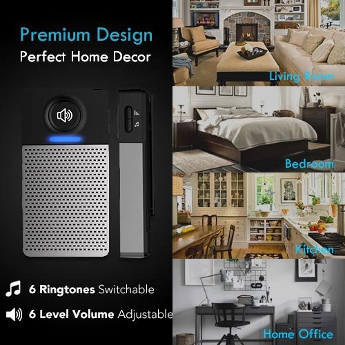 - BUILT IN 6 CHIME TONES & VOLUME ADJUSTABLE - Tenvis Wireless doorbell offers 6 different chime tones for user to select. Easy to switch the door chime tone you like by click side button on chime receiver. Also the wireless door bell is volume adjustable. It offer 6 levels volume from low to loud for user to select.