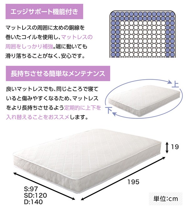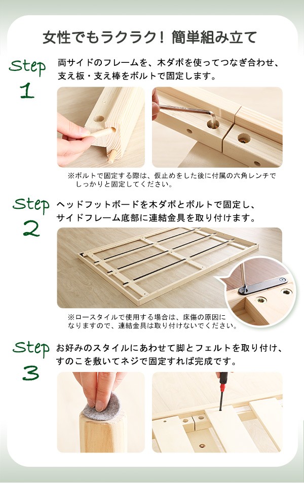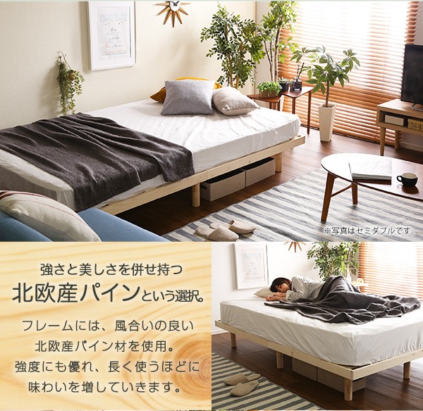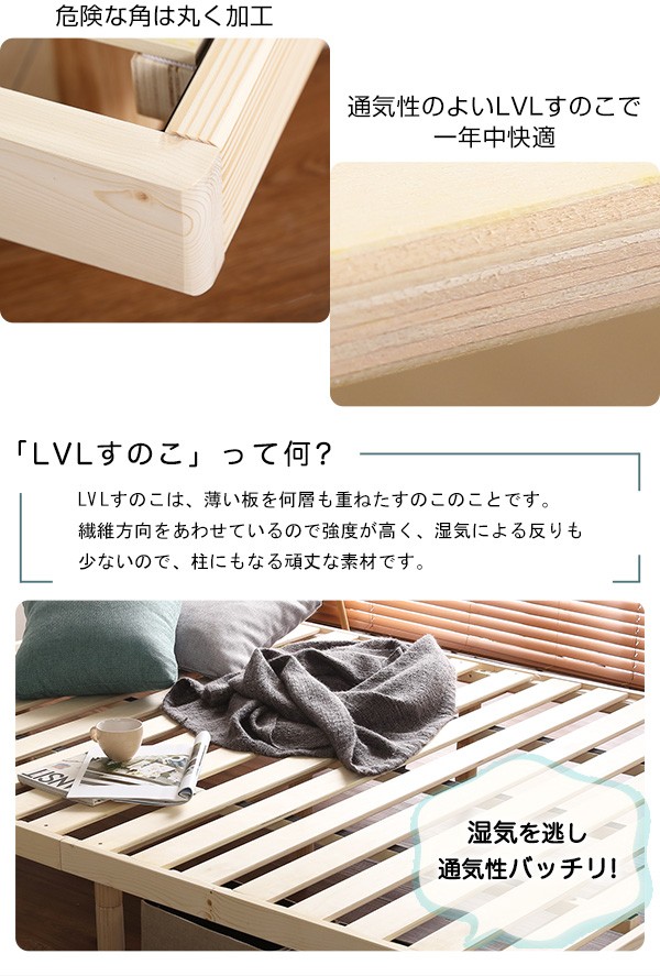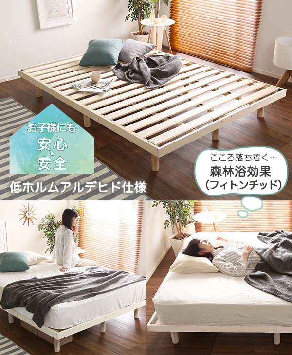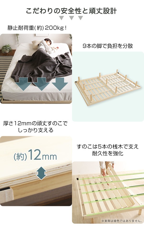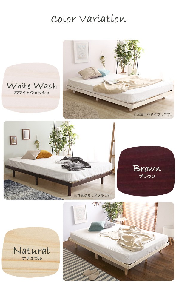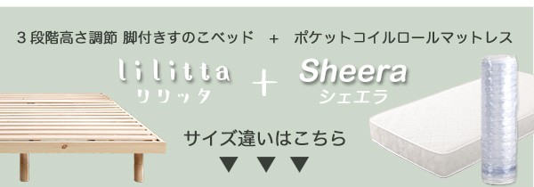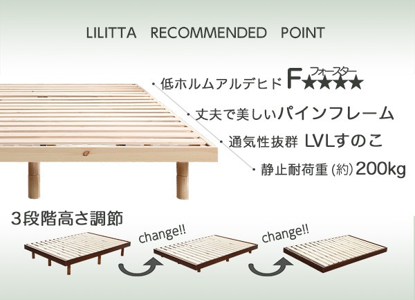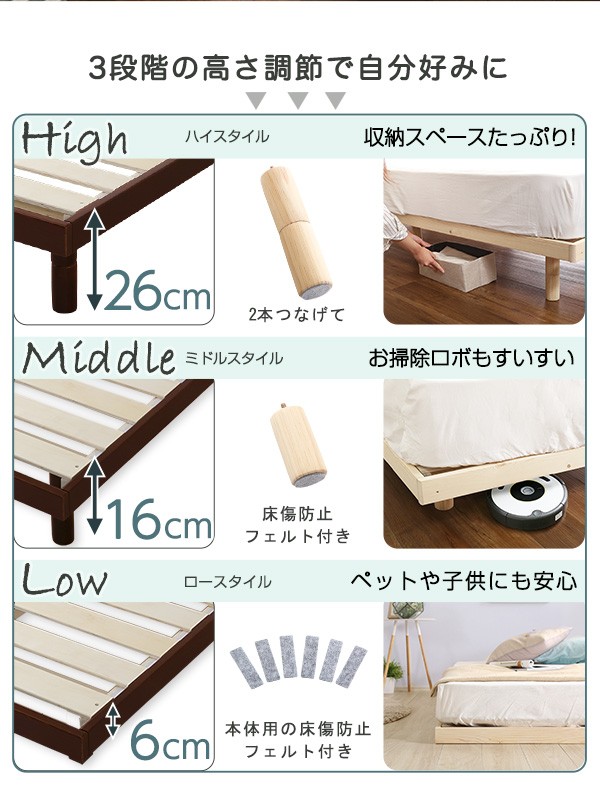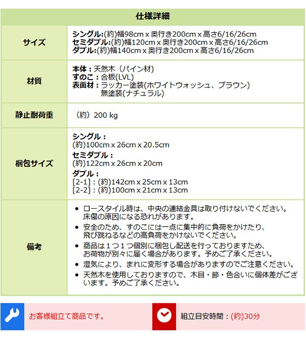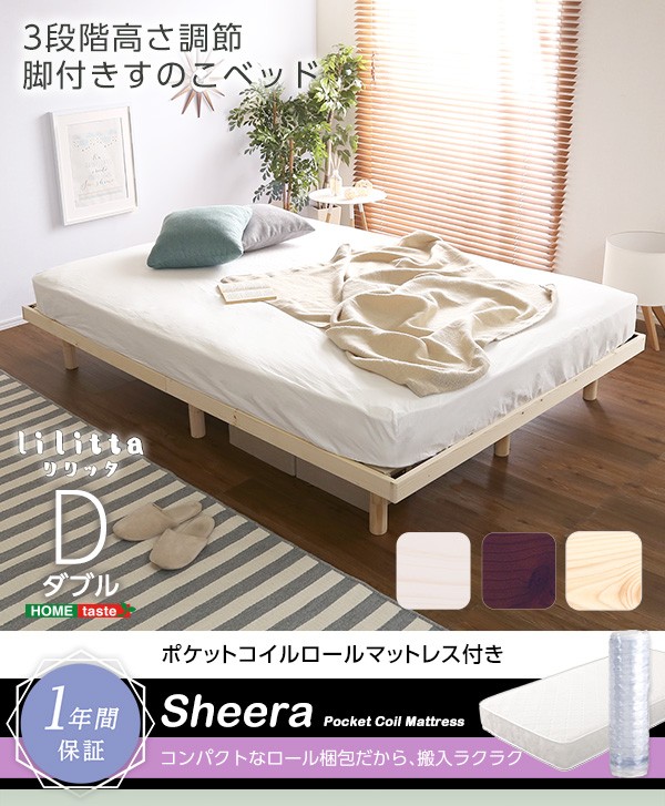 【商品について】3段階高さ調節 脚付きすのこベッド(ダブル) 【Lilitta-リリッタ-】(ポケットコイルロールマットレス付き) ダブル■サイズ:【商品サイズ】ベッド:(約)幅 140 x 奥行 200 x 高さ 6/16/26 cmマットレス:(約)140cmx195cmx19cm(コイル数:682個)【商品重量】ベッド:25.2kgマットレス:(約)23.5kg【梱包サイズ】ベッド:2梱包でお届けします。(1)(約)幅 142 x 奥行 25 x 高さ 13 cm(2)(約)幅 100 x 奥行 21 x 高さ 13 cmマットレス:(約)38cmx38cmx76cm【梱包重量】ベッド:(2-1)17.25kg(2-2)9.15kgマットレス:(約)25kg■カラー:ホワイト、ブラウン、ナチュラル(無塗装)■素材:ベッド:[本体] 天然木(パイン材) [すのこ] 合板(LVL) [表面材] ラッカー塗装(ホワイトウォッシュ、ブラウン) 無塗装(ナチュラル)マットレス:[張り材] ポリエステル100% [クッション材] ポケットコイル、ウレタンフォーム、不織布■その他:お客様組立商品です。組立目安時間 約30分