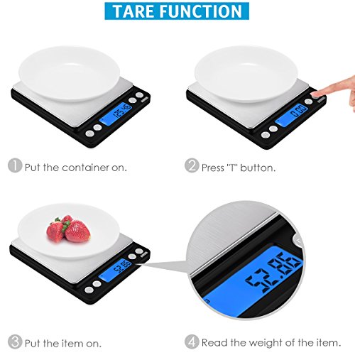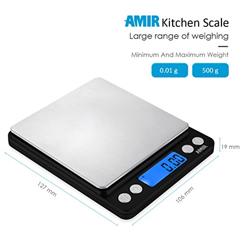 Color: Black High-precision Pocket Food Scale has high accuracy (0.01g), versatility and convenience you need, whether your focus is diet management or culinary excellence. It can meet all your demands. AMIR digital scale can quickly and accurately measure ingredients, postage, medication and more with a weight range up to 500 grams. Calculate in g, oz, tl, ct, and gn and convert between units instantly with a single press of a button without having to re-measure. Special Function: Count Pieces This digital table-top scale includes piece counting function, which is incredibly helpful for hunting, jewelry, and cooking. It's simple technology for smart living. To adjust the idle time for the auto off function When the scale is turned off, press and hold "M" key, at the same time, press "ON/OFF" key for 4 times quickly till number is displayed, then release the button. To change auto-off time among 0/60/120/180 seconds: please press "M" key, after choosing, press "ON/OFF" key to confirm the setting. NOTE: The "0" option deactivates the auto-off function. Specifications: Piece counting: 25, 50, 65, 75, and 100 Six units conversion: G, OZ, OZT, DWT, GN, CT Color: Product(silver) Two covers (transparent) Weighing range: 500g/0.01g Package size: 735 mm *365 mm *19 mm Product size: 127mm*106mm*19 mm(L * W * H) Net weight: 21KG Package contents: 1 x Digital pocket scale 2 x Platform cover 2 x AAA batteries 1 x User Manual Note: 1. "Lo": Low voltage. Please replace the batteries 2. "O-Ld": Over load. Please remove item quickly to protect the scale GCID: AMIR 0 |