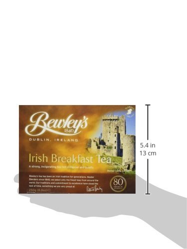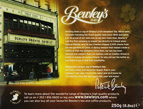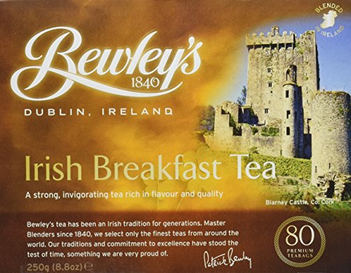 -. Binding : Grocery -. Brand : Bewley's -. EAN : 0034064202018 -. Feature : This fine breakfast blend consists of top quality small leaf Darjeeling and top quality Rwandan and Assam Indian teas / It has a creamy, malt flavor with a pleasant aftertaste / This is the tea that is served in Bewley's Cafes in Ireland / Its strong flavor is best complemented by the addition of milk -. Label : Bewley Irish Imports -. Manufacturer : Bewley Irish Imports -. MPN : 034064202018 -. NumberOfItems : 1 -. PackageQuantity : 1 -. PartNumber : 034064202018 -. ProductGroup : Grocery -. ProductTypeName : GROCERY -. PublicationDate : 2012-07-13 -. Publisher : Bewley Irish Imports -. Studio : Bewley Irish Imports -. Title : Bewley's Irish Breakfast Tea 250 g 80 Tea Bags -. UPC : 034064202018