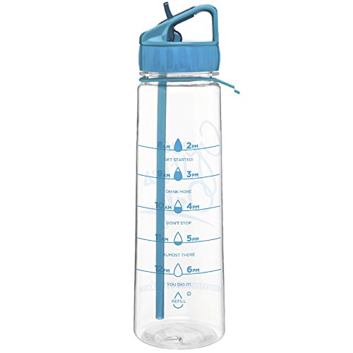Our Straw Motivational Bottle® features a motivating quote and unique timeline©, measured to keep track of your daily water intake. This bottle holds 30oz of water, fits easily in the hand and is compatible with larger cup holders. The flip straw top makes it easy to drink on the go. The unique design, durable construction and BPA-Free materials make this bottle perfect to take from work to the gym or even in the car. The straw is a convenient way for no more spills! BOTTLE FEATURES: Motivational Quote Unique Timeline© BPA- Free Plastic Carrying Loop Silicone Grip Flip- Up Straw Copolyester Material Plastic BOTTLE CAPACITY: 30 ouncesFeature