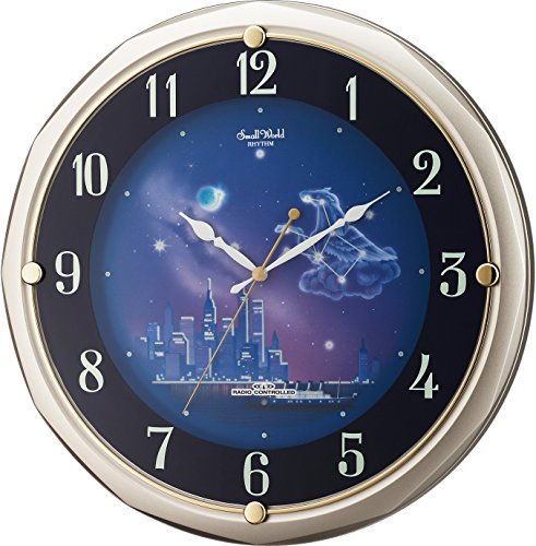 -. Title : リズム時計 電波 掛け時計 アナログ ファンタジータウンR 暗くなると 蓄光 で絵が浮び上がる インテリア クロック 金色 Small World 4MY819RH18