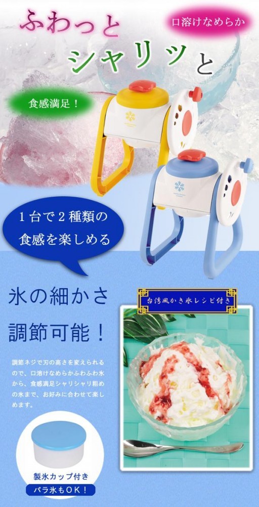 調節ネジで刃の高さを変えられるので、口溶けなめらかふわふわ氷から、食感満足シャリシャリ粗めの氷まで、お好みに合わせて楽しめます。 |