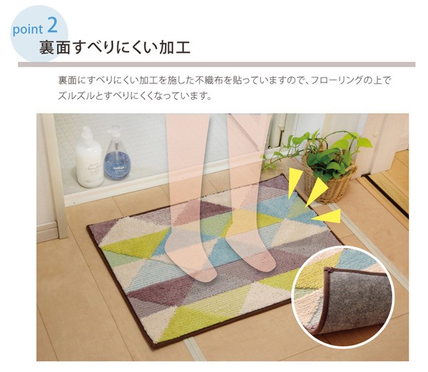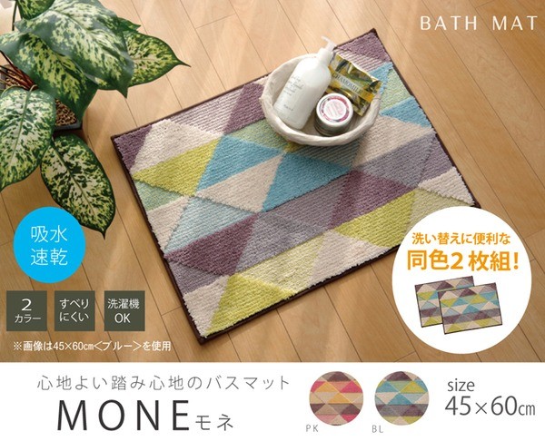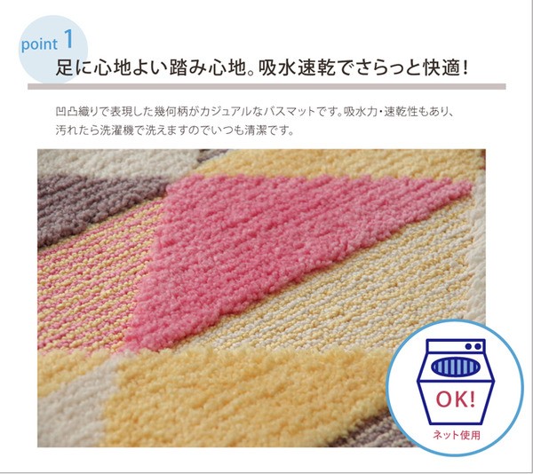 カラフルなカラーのバスマットです。吸水性に優れた商品です。織り方で凹凸感をつけました。さらっとしたやわらかな肌触りの商品です。裏面には滑りにくい加工を施しています。ご家庭の洗濯機で洗えますので、お手入れも簡単です。(洗濯の際はネットをご使用ください)