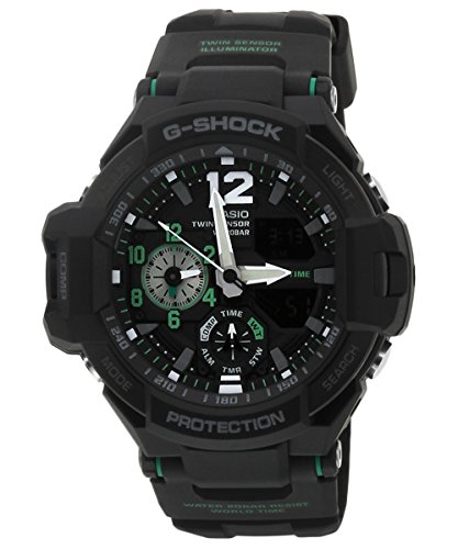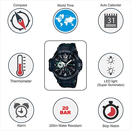 Brand, Seller, or Collection Name:Casio Model number:GA-1100-1A3DR (G595) Part Number:GA-1100-1A3DR (G595) Item Shape:ROUND Dial window material type:Mineral Display Type:Analog Case material:Plastic Case diameter:5.2 centimeters Case Thickness:17 Band Material:Resin Band width:20 millimeters Band Color:BLACK Dial color:Black Calendar:Yes Special features:twin sensor Item weight:3.04 Ounces Movement:Quartz Water resistant depth:100 Meters