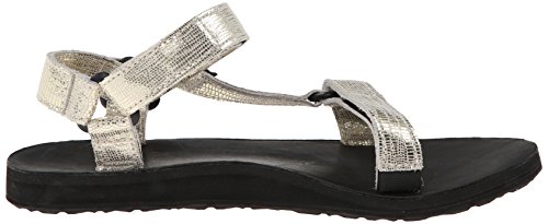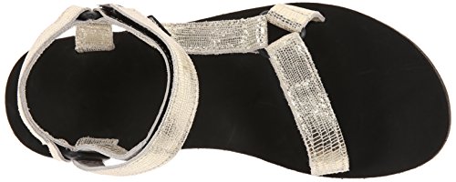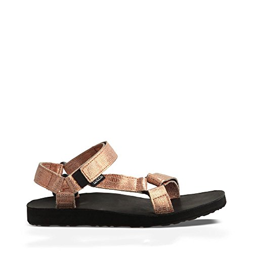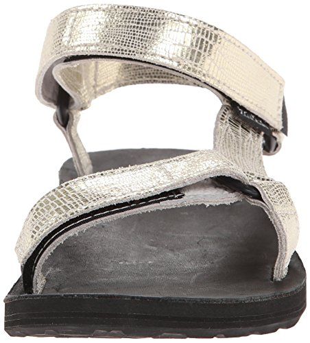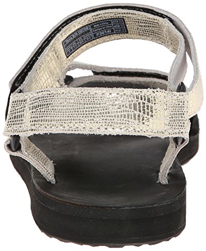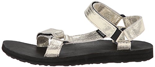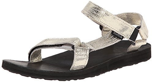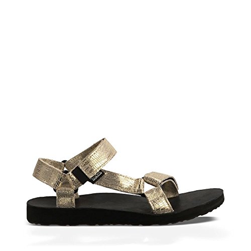 Classic outdoor sandal with adjustable hook-and-loop straps in shimmery textured finish Leather-covered contoured footbed Contoured EVA footbed for support Durabrasion Rubber outsole for traction Brand : Teva Item model num : Original Univ Lthr Metallic-W MPN(PartNumber) : 1007549-GOLD EAN : 0737045331126