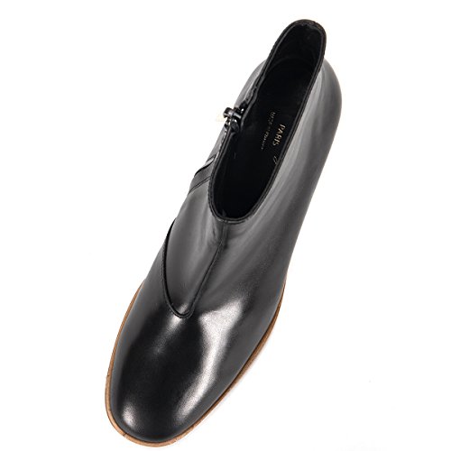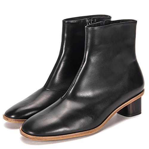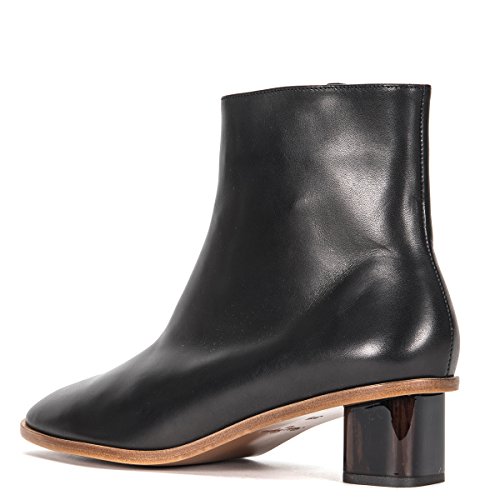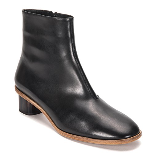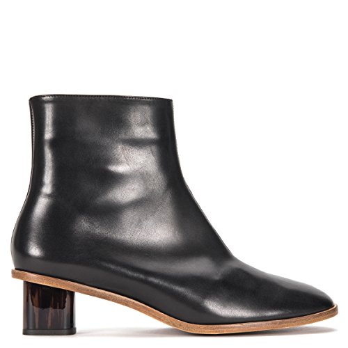 Product Description Buffed leather ankle boots in black. Round toe. Zip closure at inner side. Glossy block heel in tones of brown and black. Leather sole in tan. Tonal stitching. Upper: leather. Sole: leather. Made in France. 0