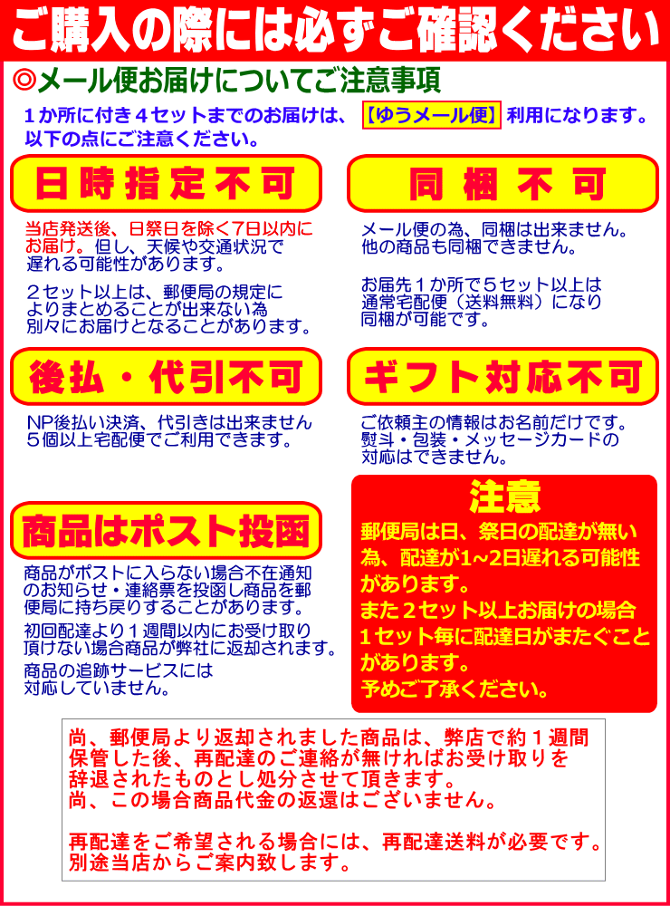本来メール便商品では、NP後払い決済・代引きがご利用出来ない為、宅配便に変更になります。お届け先1ヶ所4個以内の場合、送料(北海道・沖縄1540円、東北650円、信越・関東・近畿・中国・九州540円、四国450円)と手数料が必要になります。