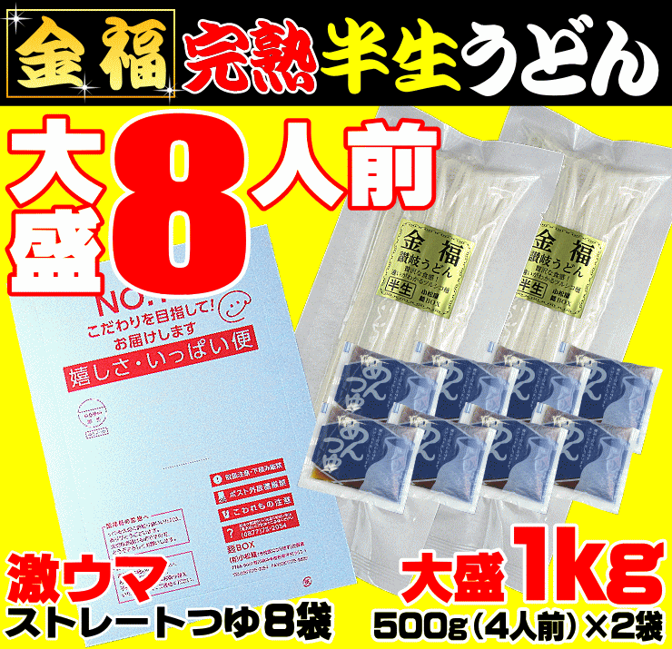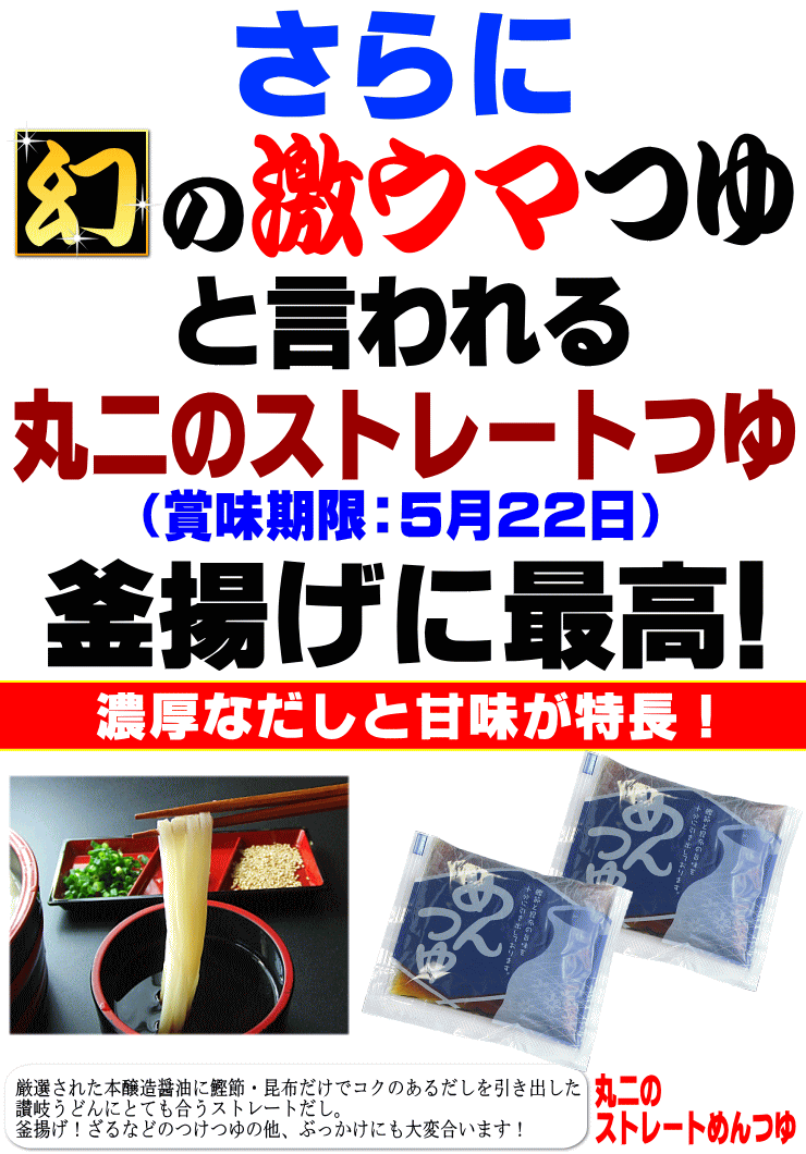 名称■金福半生讃岐うどんつゆ付セット(8~10人前) 原材料名■半生完熟讃岐うどん・並麺小麦粉(ASW)、食塩、加工でん粉、酒精■丸二製めんつゆ(ストレート)砂糖、本譲造醤油、食塩、かつおぶしエキス 醗酵調味料、こんぶエキス、調味料(アミノ酸等) カラメル色素(原材料の一部に大豆、小麦を含む) 内容量■半生完熟讃岐うどん・並麺1袋(500g)×2袋(8~10人前) ■丸二製めんつゆ(ストレート)1袋60g×8袋(8人前)賞味期限以下全て常温■半生完熟讃岐うどん・並麺約45日■丸二製めんつゆ(ストレート)2016年5月22日
