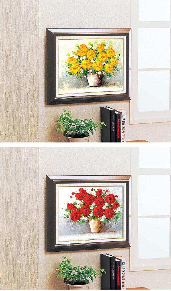| 豪華なバラを落ち着きのあるフレームに入れました。作者が一品一品心をこめて描きあげた肉筆画です。黄色いバラには開運力・金運、赤いバラには愛情運・発展運という、風水の意味を込めて描かれています。 |