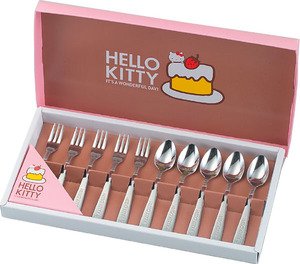 Set of 10 hello kitty small fork and spoon set. Spoon: 5 inches x 1 inches. Fork - 5 inches x 0.5 inches. Material: Stainless steel. Made in Japan.