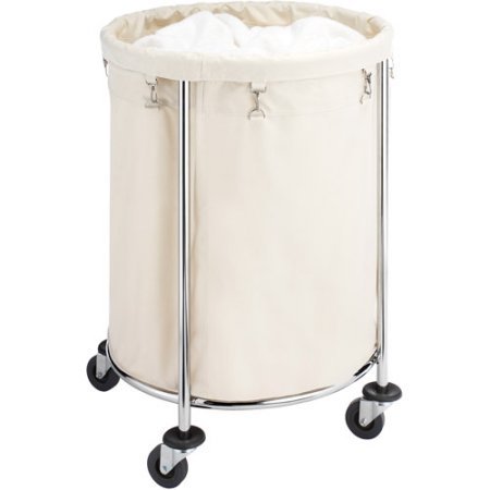-. Feature : Durable, chromed, metal frame with heavy-duty wheels / Chrome laundry hamper has bumpers on wheels to help protect walls and corners / Large, removable, heavy-duty, polyester bag / Whitmor Commercial Round Laundry Hamper requires easy assembly / Measures: 23.63"W x 32"H