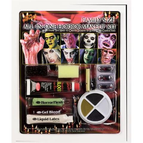 Family Size All In One Horror Kit Makeup Includes 4 Color Makeup Wheel, Tooth Black, Theatrical Blood, 3 Blood Capsules, Gel Blood, Horror Flesh, Liquid Latex, 2 Sponges And Brush.