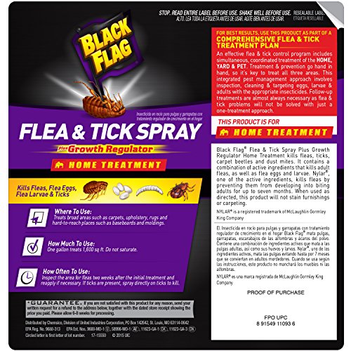 This Black Flag ready-to-use flea and tick spray with growth regulator effectively and easily treats broad areas such as upholstery, rugs and hard-to-reach places such as baseboards and moldings. The growth regulator helps to break the flea cycle by killing adult fleas, flea eggs and flea larvae and help to prevent flea-infestations for up to 7 months. Black Flag HG-11093-1 Flea & Tick Killer Home Treatment + Growth Regulator Spray, Ready To Use, 1 Gal., 4-PK.Feature