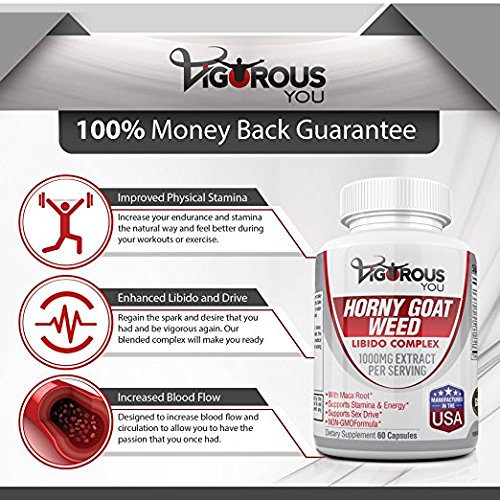 -. Feature : •NEW IMPROVED 2018 FORMULATION! 11 EXPLOSIVELY POWERFUL INGREDIENTS, GUARANTEED RESULTS: If you loved VigorousYou before, you'll EXPLODE with excitement over our newest additions - Absorption Enhancing BIOPERINE and Tribulus Terrestris support even more POWER, CONFIDENCE, ENERGY, STAMINA and PERFORMANCE alongside Maca, 1000 MG Epimedium with Icariins, L-Arginine, Panax Ginseng & Mucuna Pruriens, Polypodium Vulgare, Tongkat Ali Root, Saw Palmetto Berry & Muira Puama / •MORE STAMINA & ENERGY, GUARANTEED - LOW ENERGY MAKE YOU LOSE THAT LOVIN' FEELING? DON'T GIVE UP! Even men and women who've tried countless alternatives report how this super-potent, ultra-concentrated and POWERFUL horny goat weed supplement blend supports a fast increase of more ENERGY, STAMINA & BLISS within days of taking our super-potent - even after years of strle - without the jitters or crash! / •USE PRECAUTION - WHILE CHINESE MEDICAL PRACTITIONERS have prescribed horny goat weed as a libido booster for women as well as men for over 1000 years we must recommend you check with your doctor if you suspect any medical conditions - regardless of how many medical studies you find that back up the claims of "extra added side benefits" you'll love. / •DID YOU HEAR WHAT THEY SAID? Read the reviews about how customers say they believe it supported a surP.R.Ising increase in ENERGY, more ZEST, more HEAT and more DESIRE. Discover how it's helped 1000's of women and men transform LIMP energy into ROCK SOLID drive by clicking "add to cart" now. / •#1 SAFETY, #1 GUARANTEE: 100% NATURAL SUPPLEMENT leaves nothing to question - every drop of ULTRA-POTENT CONCENTRATION EXTRACT & ESOTERIC coating are tested and proven safe to support maximum uptake & absorption so nutrients express full impact - so go ahead and try it risk free. You'll both feel NATURALLY INVIGORATED, guaranteed, or your money back - no questions asked.