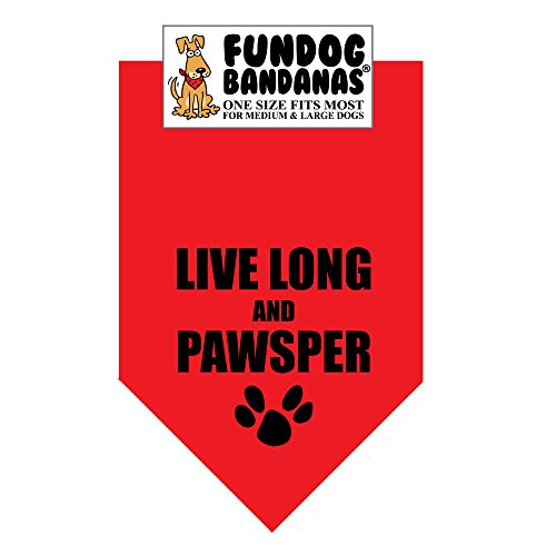 -. Binding : Misc. -. Brand : FunDog Bandanas -. Color : Black -. Feature : Cute! / Fun! / Affordable! / Makes a great gift! / Simple tie-on design for ease of use! -. Label : The Dog Perk Corporation -. Manufacturer : The Dog Perk Corporation -. PackageQuantity : 1 -. ProductGroup : Pet Products -. ProductTypeName : PET_SUPPLIES -. Publisher : The Dog Perk Corporation -. Size : One size fits most for medium to large dogs -. Studio : The Dog Perk Corporation -. Title : BANDANA - Live Long and Pawsper