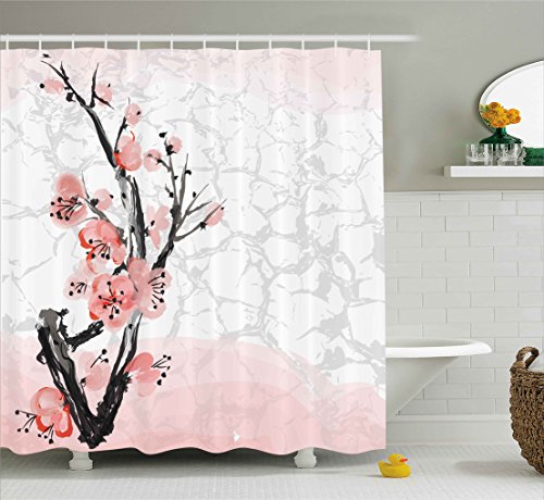 Floral Shower Curtain by Ambesonne, Japanese Cherry Blossom Sakura Tree Branch Soft Pastel Watercolor Print, Fabric Bathroom Decor Set with Hooks, 70 Inches, Coral Light Pink Grey