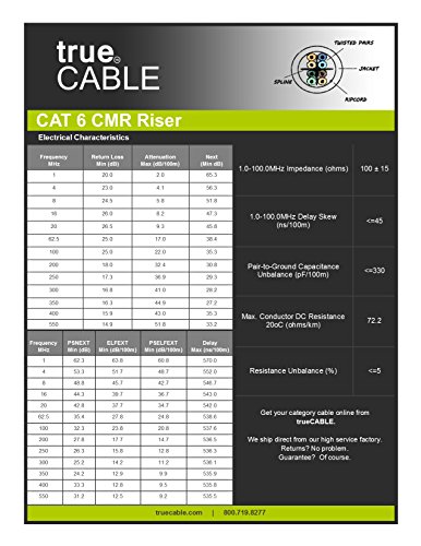 HIGH PERFORMANCE DATA CABLE. This riser rated cat 6 network cable is 23 AWG with 4 pairs (8C). Suitable for Fast, Gigabit, and 10-Gigabit Ethernet. Supports bandwidth of up to 550 MHz.