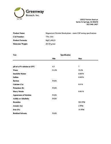 -. Binding : Health and Beauty -. Brand : Greenway Biotech, Inc. -. EAN : 0701748874501 -. Feature : Pure Magnesium Chloride USP (Pharmaceutical Grade) 2 Pounds / Relieves aches and pains / Helps with restoring cellular Magnesium level / It could be consumed orally / From Dead Sea in Israel -. IsAdultProduct : 0 -. Label : Greenway Biotech, Inc. -. Manufacturer : Greenway Biotech, Inc. -. ProductGroup : Health and Beauty -. ProductTypeName : HEALTH_PERSONAL_CARE -. Publisher : Greenway Biotech, Inc. -. Studio : Greenway Biotech, Inc. -. Title : 1 Pound Magnesium Chloride USP (Pharmaceutical Grade) 100% Edible "Greenway Biotech, Inc. Brand" -. UPC : 701748874501