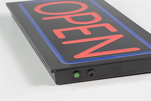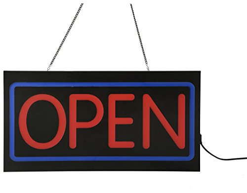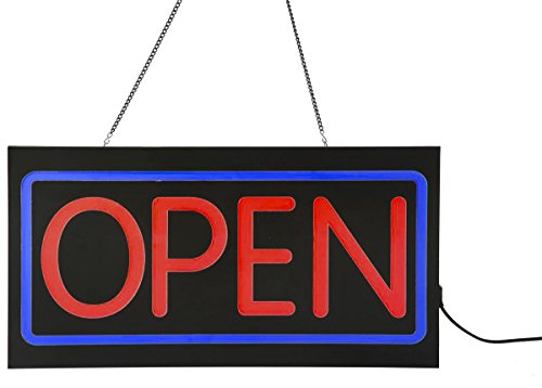 Displays2go Red Lettering with Blue Border, Hanging Window Sign Used LED Bulbs Behind Epoxy Open Sign with Chain for Hanging in Storefront Window (JLEDOPHZ)