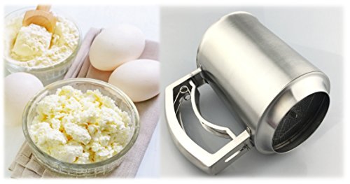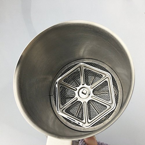 Specification: ★ Materail: 18/8 stainless steel ★ Color: Silver ★ Dimension: 3.85"Wx5.11"H ★ Product Weight: 13.2 ounces How to clean a flour sifter Remove the mesh sifting mechanism from the sifting tool, and dump any loose powder from the sifter into the garbage. Use a can of compressed air to spray bursts of air through the mesh sifter to clear out all remaining powder. 0
