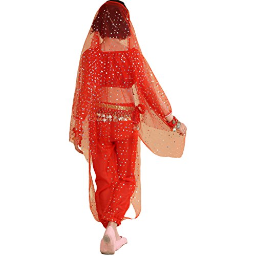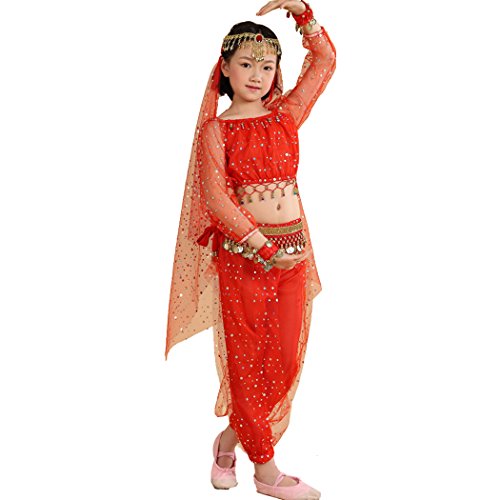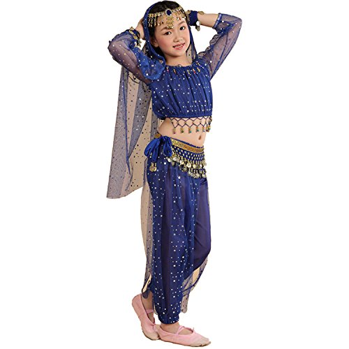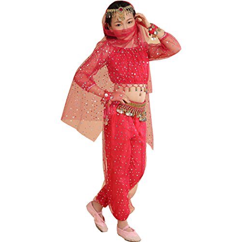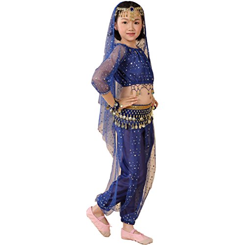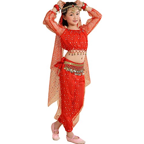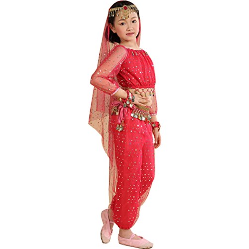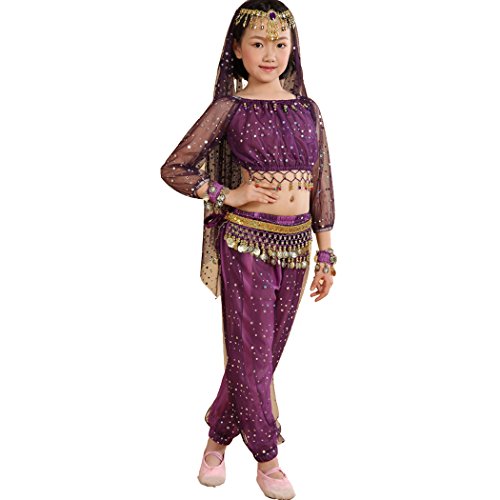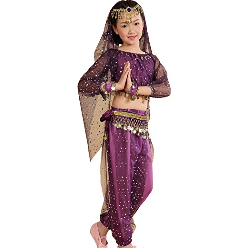 -. Feature : Girl`s belly dance costumes,fit for performance and shows, / tops:long sleeve light spot ,elegent, / please refer to the measured size on Product Descriptions,if your girl not very thin,please choose a largger size, / please note,due to lighting and different monitors, the real colours may be slightly different from the pictures, / Package Include:1*suit, (total 7pcs:top+pants+waist belt+2pcs bracelets+head chain+veil),shoes are not included
