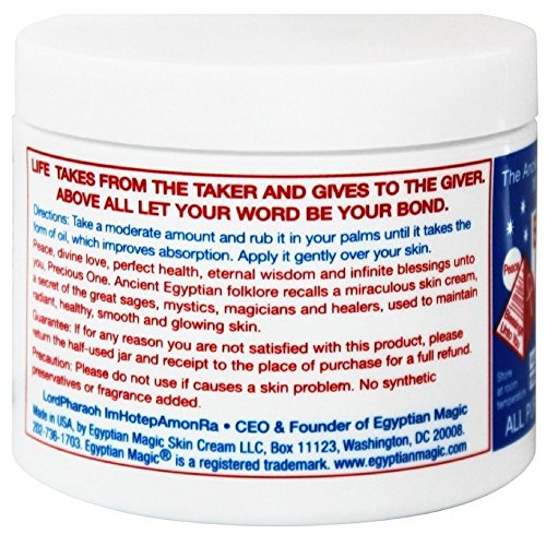 ONLY SIX INGREDIENTS (ALL NATURAL): Olive Oil, Bees Wax, Honey, Bee Pollen, Royal Jelly, and Bee Propolis. With its unique formula and handmade attention during every step of the manufacturing process, Egyptian Magic Skin Cream utilizes the natural preservatives found in our ingredients to provide an effective "healing" balm. Does not contain additives, preservatives, fragrances, chemicals, parabens, GMO ingredients, and is NOT tested on animals