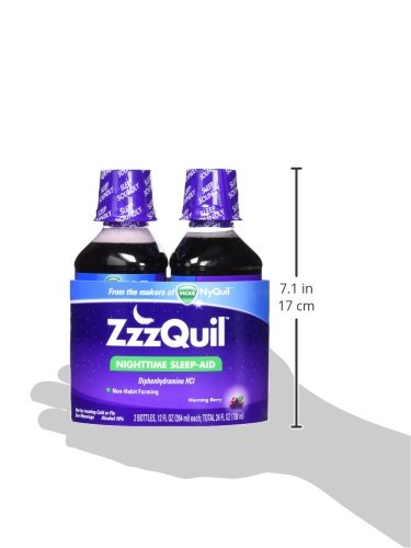 -. Binding : Health and Beauty -. Brand : Vicks -. EAN : 0323900016194 -. Feature : For the relief of occasional sleeplessness, reduces time to fall asleep if you have difficulty falling asleep. / Not for colds. Not for pain. Just for sleep. Sleep soundly so you can wake refreshed. / Non-Habit Forming / Not for treating cold or flu. / 0 -. Label : P&G -. Manufacturer : P&G -. NumberOfItems : 1 -. PackageQuantity : 1 -. ProductGroup : Pantry -. ProductTypeName : HEALTH_PERSONAL_CARE -. Publisher : P&G -. Studio : P&G -. Title : ZzzQuil Nighttime Sleep Aid, Warming Berry Liquid, 2x12 Fl Oz -. UPC : 323900016194