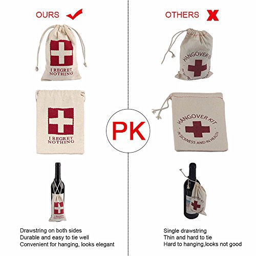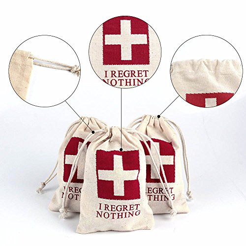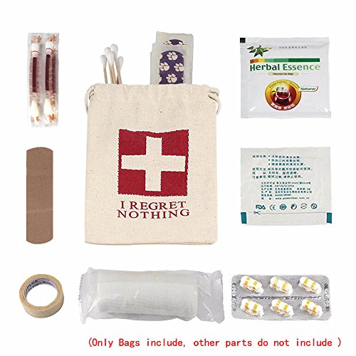 Studio : HuntGold Publisher : HuntGold Binding : Health and Beauty Product Description Description: Multipurpose function: this natural muslin hangover kit bags are ideal for all kinds of party during this special seasoning, christmas party, new years eve, annual party etc.? Give your friends and guests a leg up in hangover defense for the next morning by adding your favorite remedies like advil, ear plugs, band aids, candy or breath mints. Unique design: the vintage look red only printed on the front, has more natural appearance. Specification: Pattern: Natural White Muslin drawstring bag, stamped with a red cross and the red font of "HANGOVER KIT" and "REGRET" Material: Cotton blend Muslin Size: approx.10.5*15cm Capacity : a packet of advil, two tablets of antacids, a mint, band-aids, and a tea bag.and still had room for more. Care: Durable and reusable, hand washing Package Included: 1*Bag Please kindly Note: Items will be repackaged to save your shipping charge to be enviromentally friendly. We guaranty the item wil be protected well in buble bags, No retail box! 0