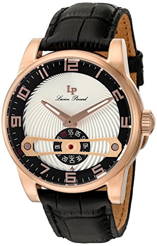 Silver textured dial with black border, rose gold tone and white hands and rose gold tone Arabic numerals; luminous; rose gold tone ion-plated stainless steel case; black leather strap