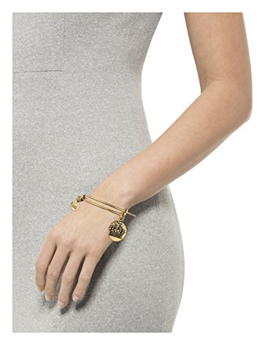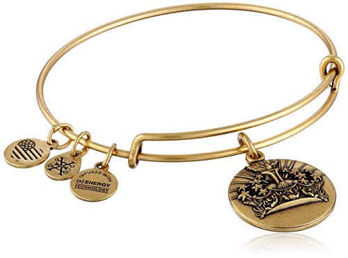 Expandable bangle bracelet featuring crown charm and three stamped Alex and Ani charms
