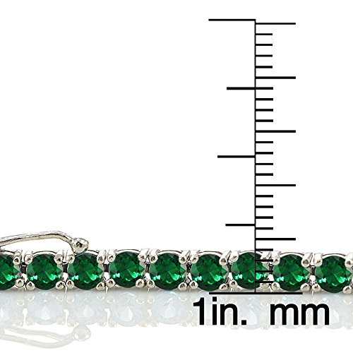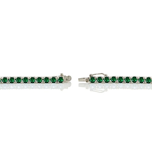 This glamorous tennis bracelet showcases glistening round 4mm created emerald gemstones all around. The bracelet is crafted of sterling silver and secured by a box post with a safety latch.