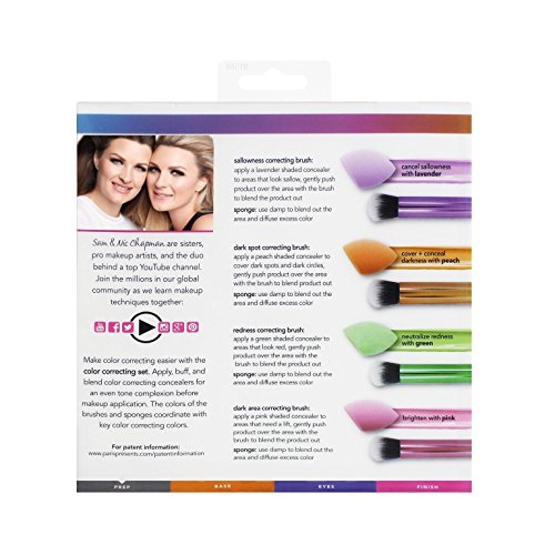 - COLOR CODED CORRECTION: Each brush and sponge in the Color Correcting Essentials kit is color coded to match their concealers. Lavender for cancelling sallowness, peach for concealing darkness, green to neutralize redness, and pink to brighten dull areas.