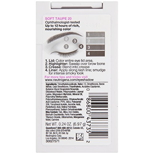 ReleaseDate : 2015-02-10 Studio : Johnson Johnson SLC Publisher : Johnson Johnson SLC Binding : Health and Beauty Product Description Use Neutrogena Nourishing Long Wear Eye Shadow Built-in Primer to enjoy up to 12 hours of rich, nourishing eye shadow color. This eye makeup features built-in eyelid primer that helps prevent creasing and smudging for beautiful eye shadow color that lasts. The formula is infused with vitamins and skin-nourishing conditioners for the delicate eye area. This eye primer is ophthalmologist tested and safe for sensitive eyes. 0