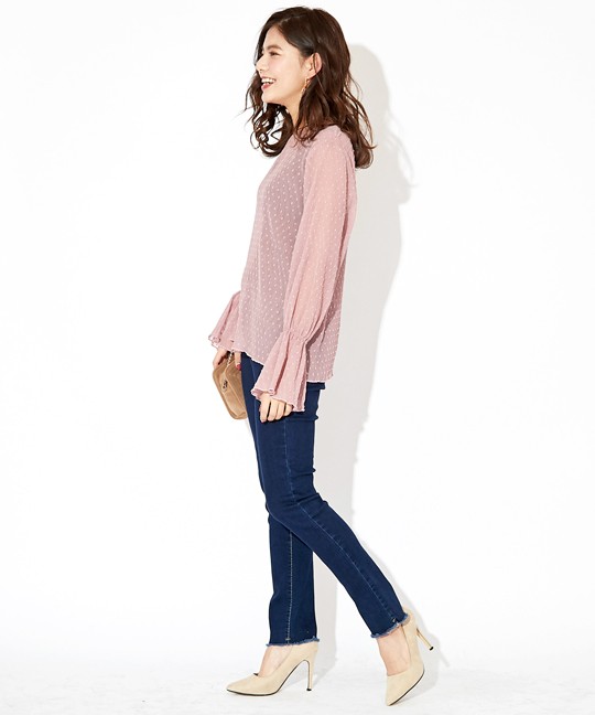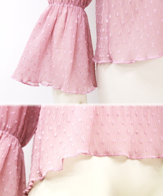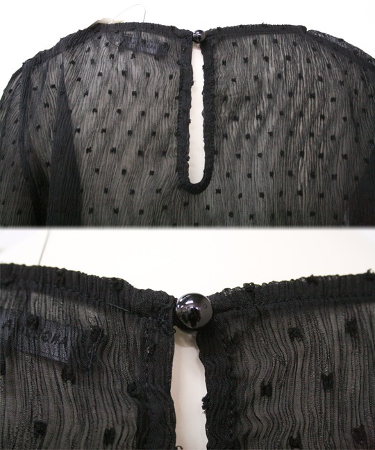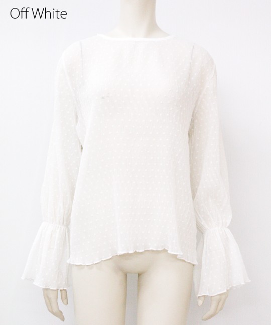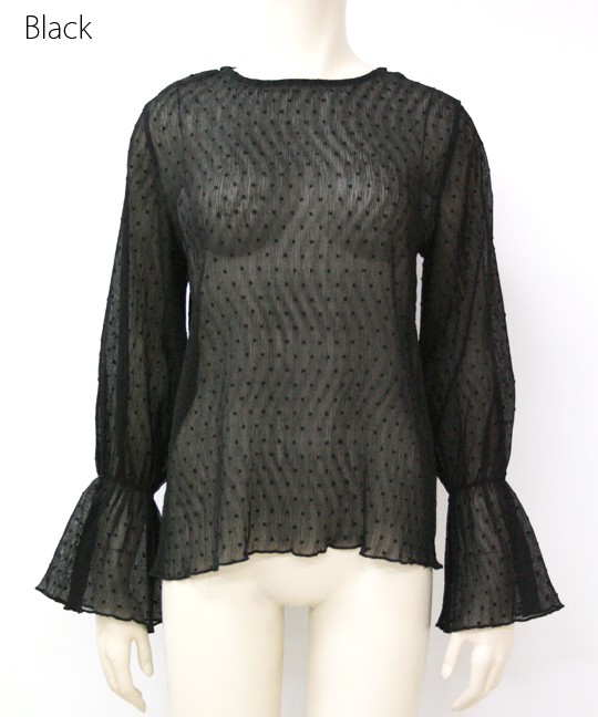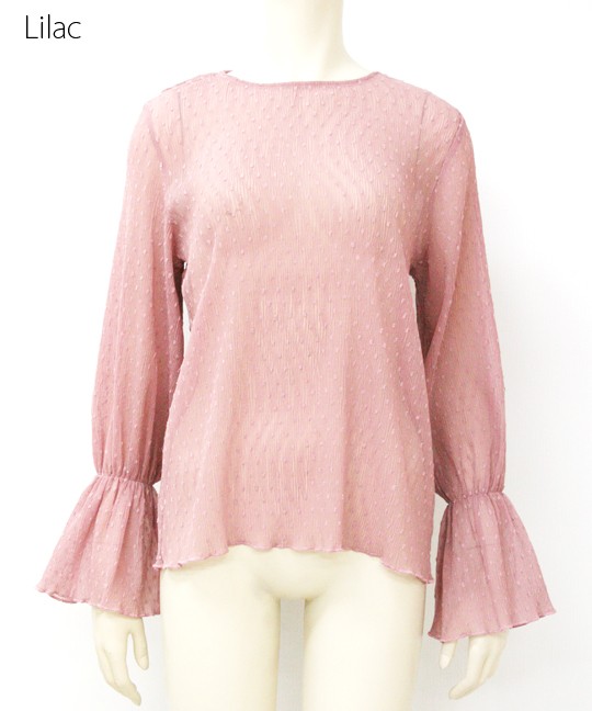 細かいプリーツのようなシワ加工が施されたブラウスは、伸縮性に富んだ珍しい生地です