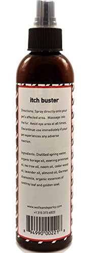 Is your pet constantly bothered by skin irritations and hotspots? Frustrated by frequent trips to the vet? Our Itch Buster provides relief from the unrelenting. Putting a stop to the itching cycle is vital because it can develop into a permanent nervous habit. End it now with Itch Buster! (8oz/236ml) Ingredients: Distilled spring water, organic borage oil, evening primrose oil, tea tree oil, neem oil, cedar wood oil, lavender oil, almond oil, German chamomile, organic essences of comfrey leaf and golden seal.Feature