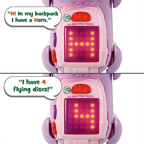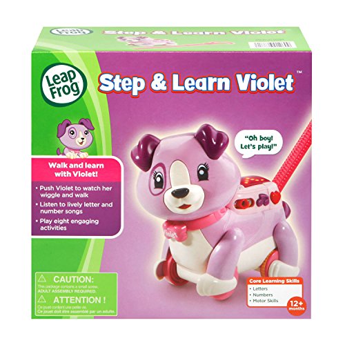 -. Binding : Toy -. Brand : LeapFrog -. EAN : 3417766012609 -. Feature : Push Violet and watch her head, legs and tail move while she sings educational songs / Choose from three modes of play including letters, number and Play with Violet / Hear songs about letters and numbers while also seeing them scroll by on Violet's LED backpack screen / Press the arrow buttons to play letter, number or funny sounds while developing fine motor skills / Take care of Violet and take her on walks to develop gross motor skills. This interactive puppy requires 3 AAA batteries (included for demo purposes only, replace them for regular use). Product Dimensions: 9.5 x 9.3 x 5.0 inches -. IsAdultProduct : 0 -. Label : LeapFrog -. Manufacturer : LeapFrog -. MPN : 80-601260 -. PartNumber : 80-601260 -. ProductGroup : Toy -. ProductTypeName : TOYS_AND_GAMES -. Publisher : LeapFrog -. Studio : LeapFrog -. Title : LeapFrog Step and Learn Violet